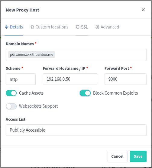 Do cả NPM và Paparless-ngx đang cùng nằm trong mạng Docker thuanbuidepchai nên có thể kết nối trực tiếp với nhau bằng Hostname và Port. Nhờ vậy chúng ta không cần phải nhập địa chỉ IP của máy chủ vào mục Forward Hostname / IP và cũng không cần phải mở truy cập port 8000 của Paperless-ngx ra bên ngoài.