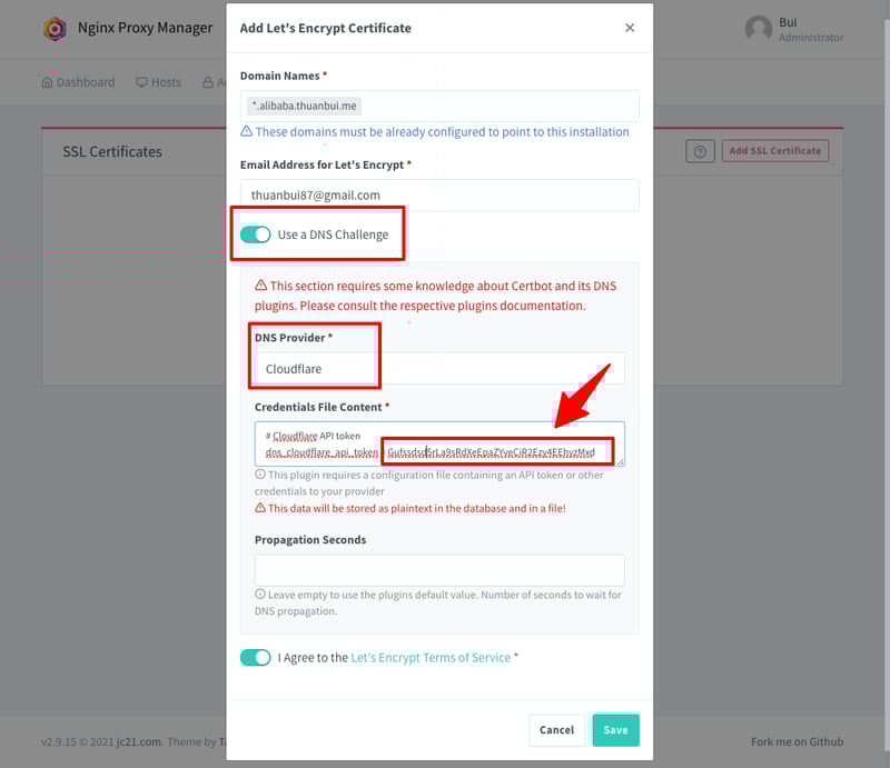 Sau khi đã nhập API Token vào mục Credential File Content, bấm nút Save. Chờ vài phút để Nginx Proxy Manager xác thực tên miền và tạo chứng chỉ Wildcard SSL.