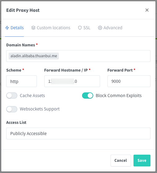 Nhập vào tên miền aladin.alibaba.thuanbui.me, và thiết lập Scheme, Forward Hostname / IP, Forward Port tương ứng. Mình thiết lập tên miền này cho Portainer nên nhập vào IP của máy chủ và port 9000