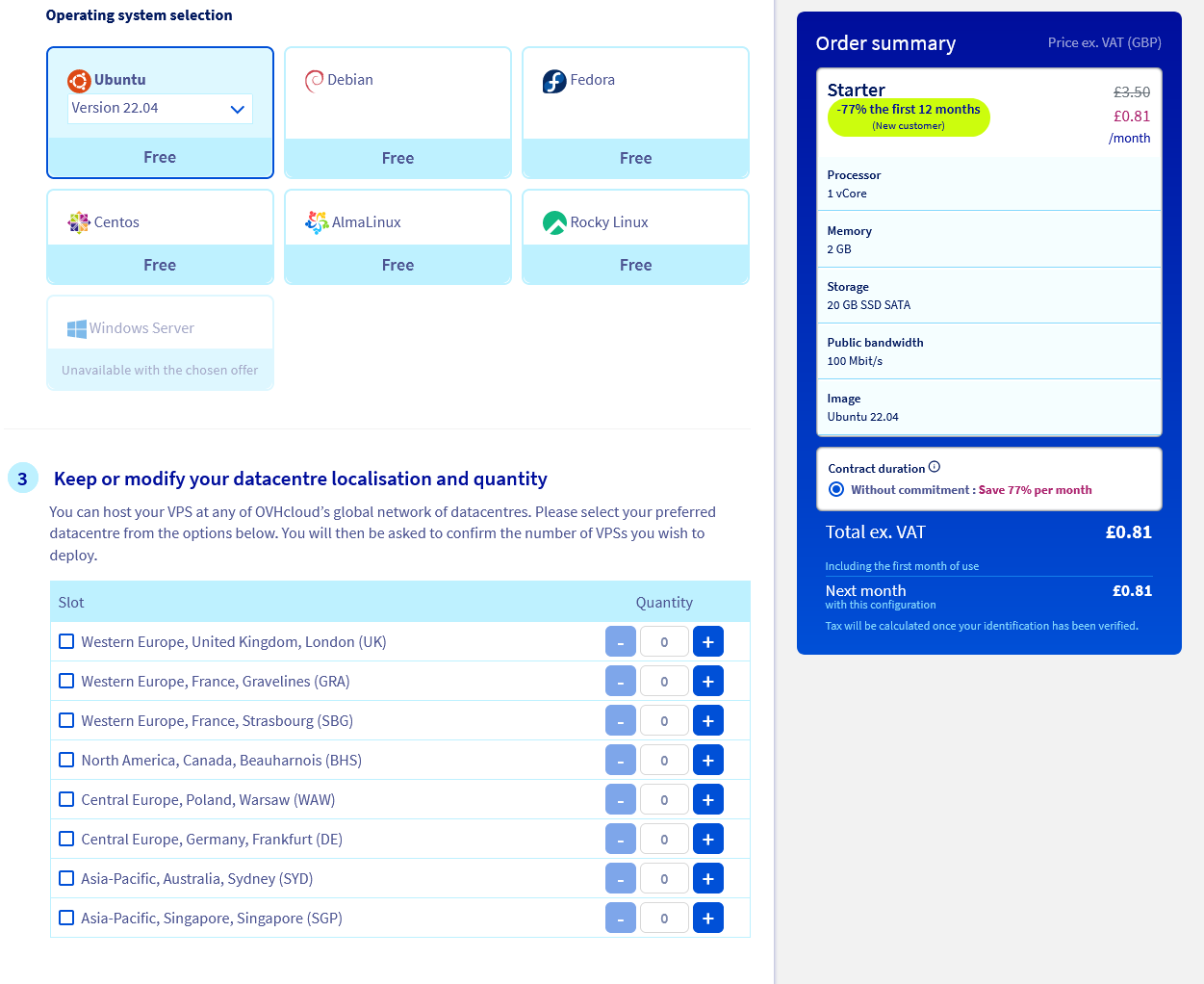 Nếu cần VPS ở các khu vực khác: Singapore, Sydney, France,… Bạn có thể truy cập trang khuyến mãi của OVH UK để đặt mua: giá £0.81 / tháng. Tuy nhiên, các ưu đãi này chỉ áp dụng cho 12 tháng đầu tiên. Sau 1 năm, giá sẽ về lại như cũ £3.5 / tháng