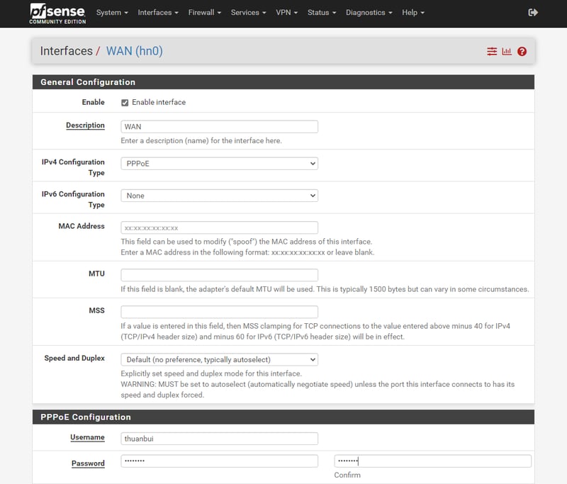 Nếu bạn sử dụng pfSense làm router chính trong nhà thì Username và Password nhập vào tên tài khoản và mật khẩu mà nhà mạng cung cấp.