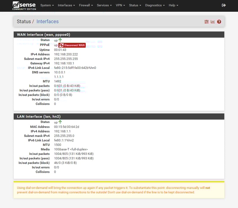 Chờ vài giây cho PPPoE Client kết nối đến PPPoE Server. Bạn có thể kiểm tra kết nối thành công chưa bằng cách truy cập vào mục Interfaces trong menu Status.