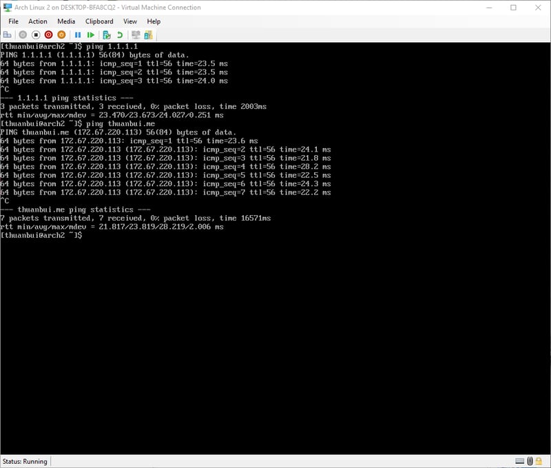 Thử lại trên máy ảo Arch Linux: kết nối Internet thành công.