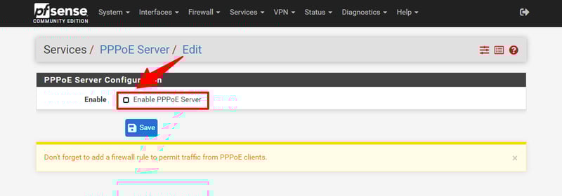 Để cấu hình PPPoE server cho pfSense, truy cập vào dịch vụ PPPoE Server trong menu Services