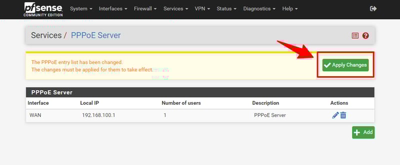 Bấm Apply Changes để kích hoạt các thông số vừa tạo trên PPPoE Server.