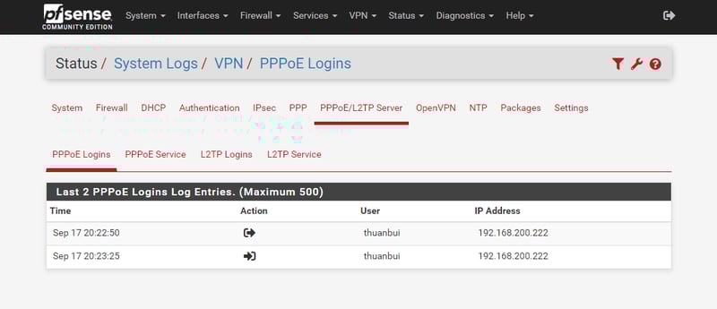 Để kiểm tra xem có PPPoE Client nào đang kết nối vào PPPoE Server không, bạn truy cập vào mục Systems Logs trong Menu Status. Sau đó chọn tab PPPoE/L2TP Server.