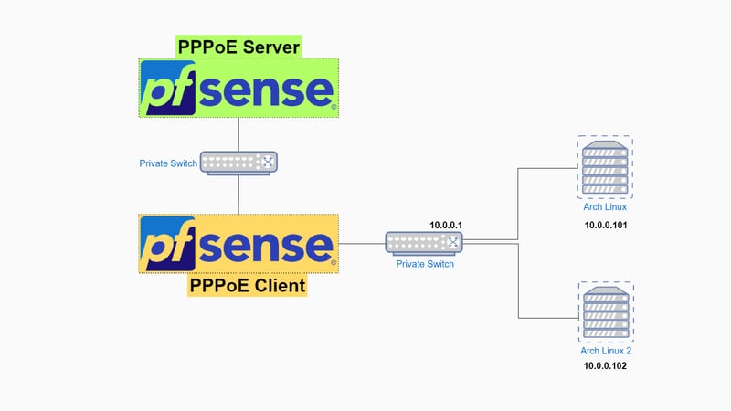 Để học cách cấu hình PPPoE Client trên pfSense, mình cần phải tạo thêm PPPoE Server trong mạng ảo. pfSense có thể được cấu hình làm PPPoE Client lẫn PPPoE Server nên mình sẽ tạo thêm 1 máy ảo pfSense và thiết lập lại mạng ảo cho pfSense Lab - [Phần 8] như dưới đây: