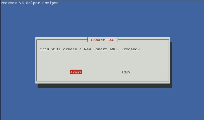 bash -c "$(curl -fsSL https://raw.githubusercontent.com/community-scripts/ProxmoxVE/main/ct/sonarr.sh)"Chọn Yes để tiếp tục