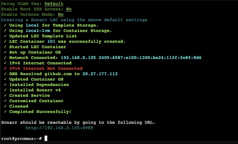 Ví dụ: mình muốn cài Sonarr, sẽ cần chạy script này trên Shell của Proxmox VE host.