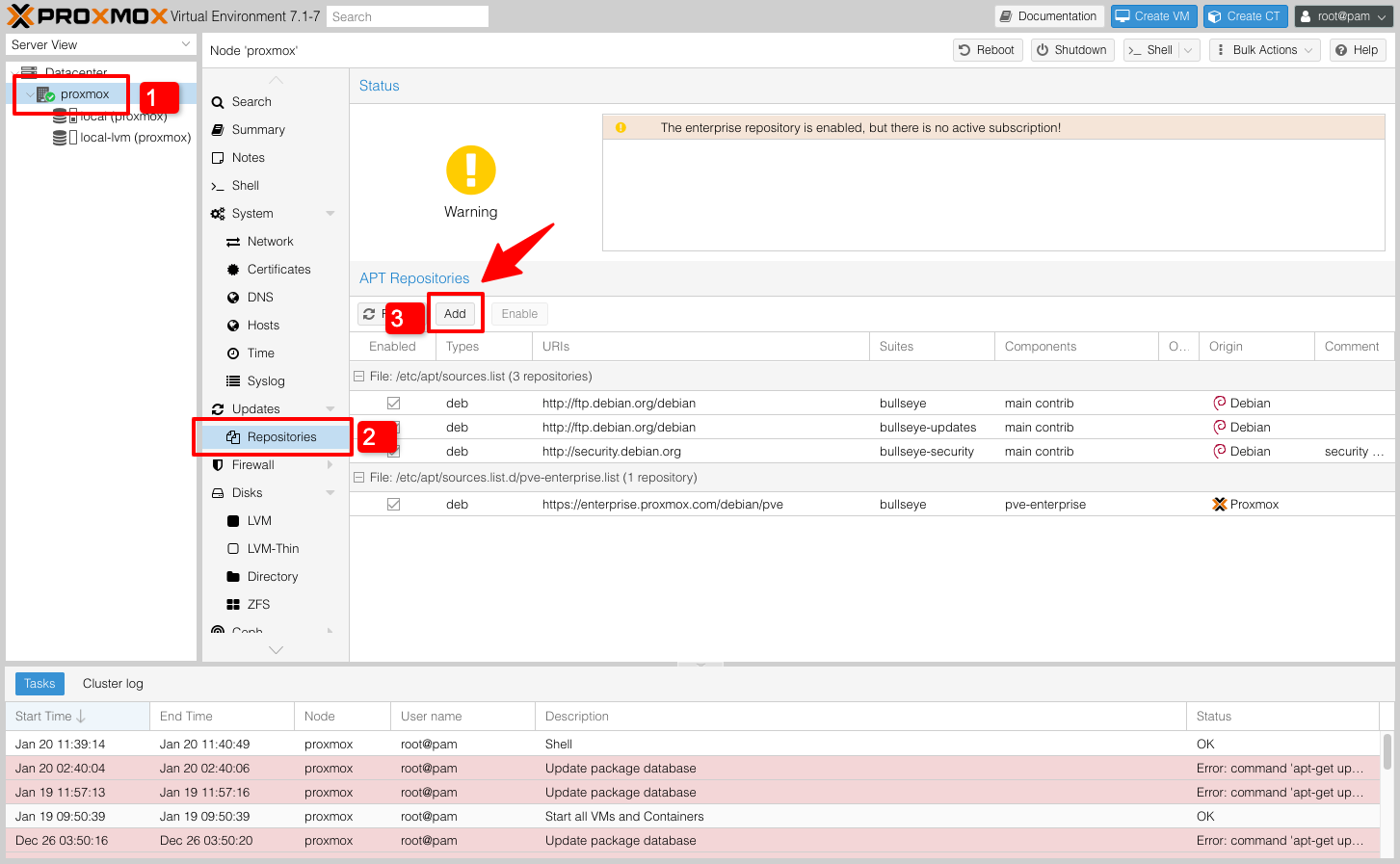 Đăng nhập vào Proxmox VE và truy cập đến mục Updates → Repositories, bấm nút Add