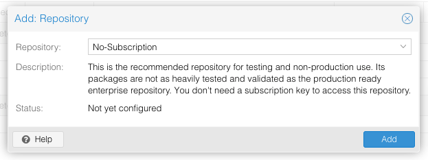 Chọn No-Subscription trong mục Repository và bấm Add để thêm vào danh sách APT Repositories của Proxmox