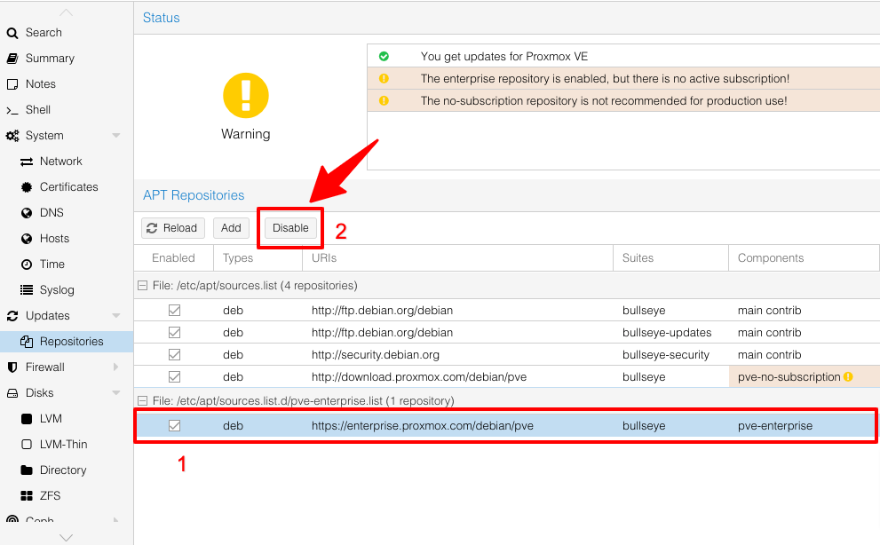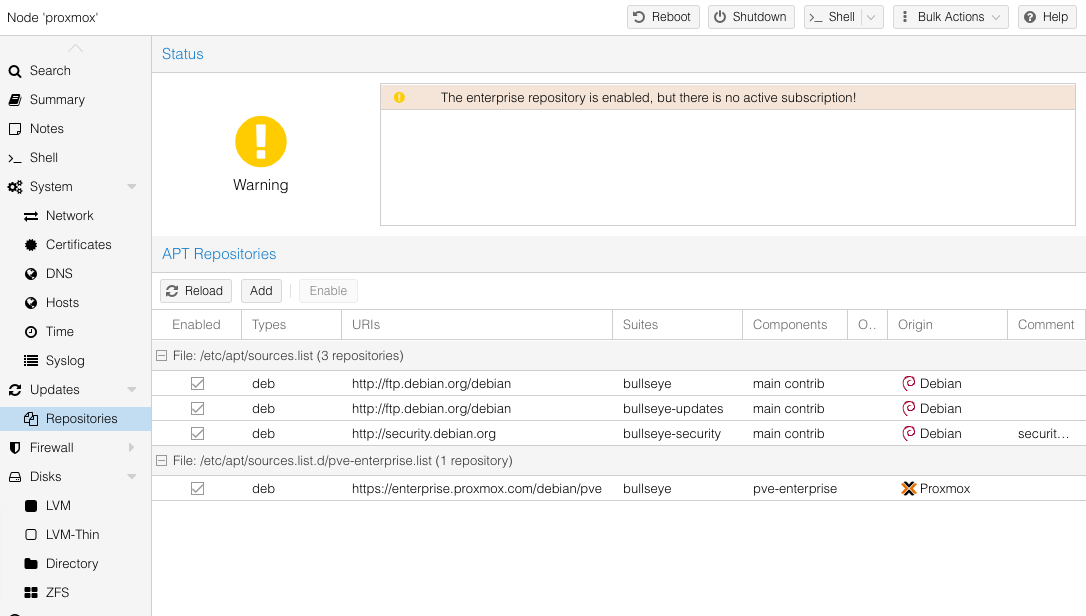 Mặc định sau khi cài đặt Proxmox VE, bạn sẽ phải đăng ký gói thuê bao subscription trả phí thì mới có thể cập nhật hệ thống lên phiên bản mới. Khi truy cập vào mục Updates → Repositories, bạn sẽ thấy thông báo “The enterprise repository is enabled, but there is no active subscription!” và không thể cập nhật hệ thống.