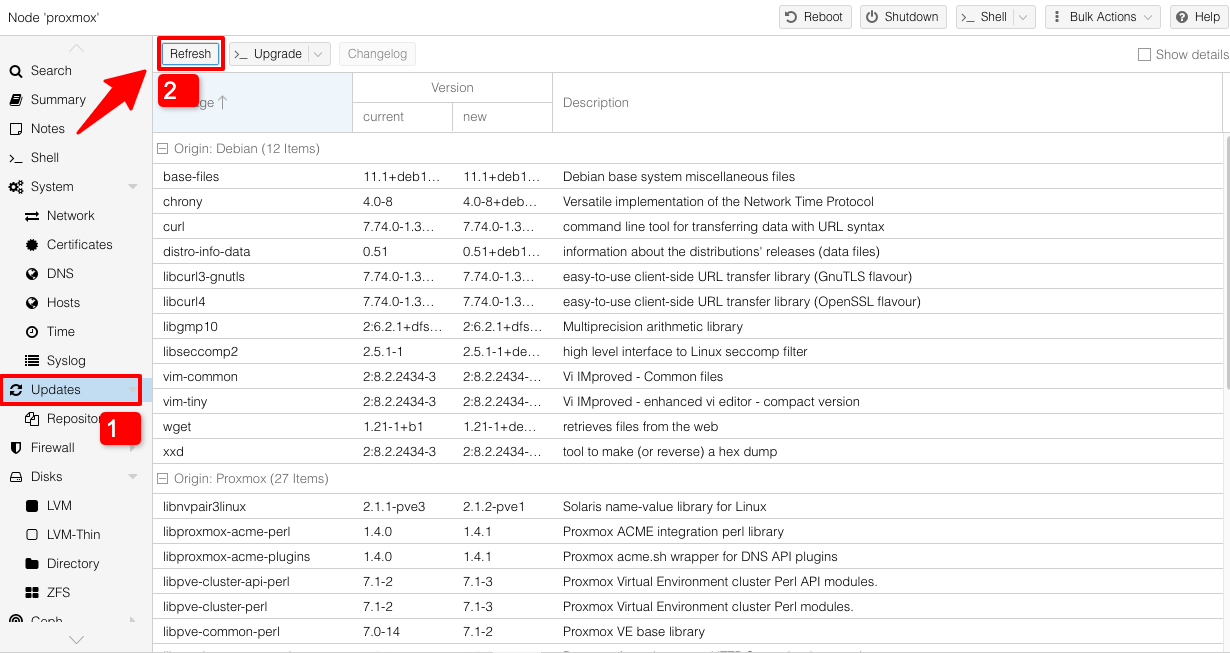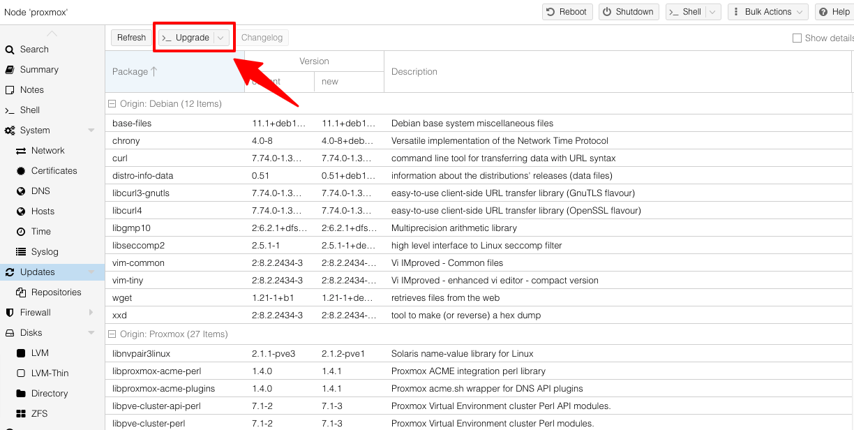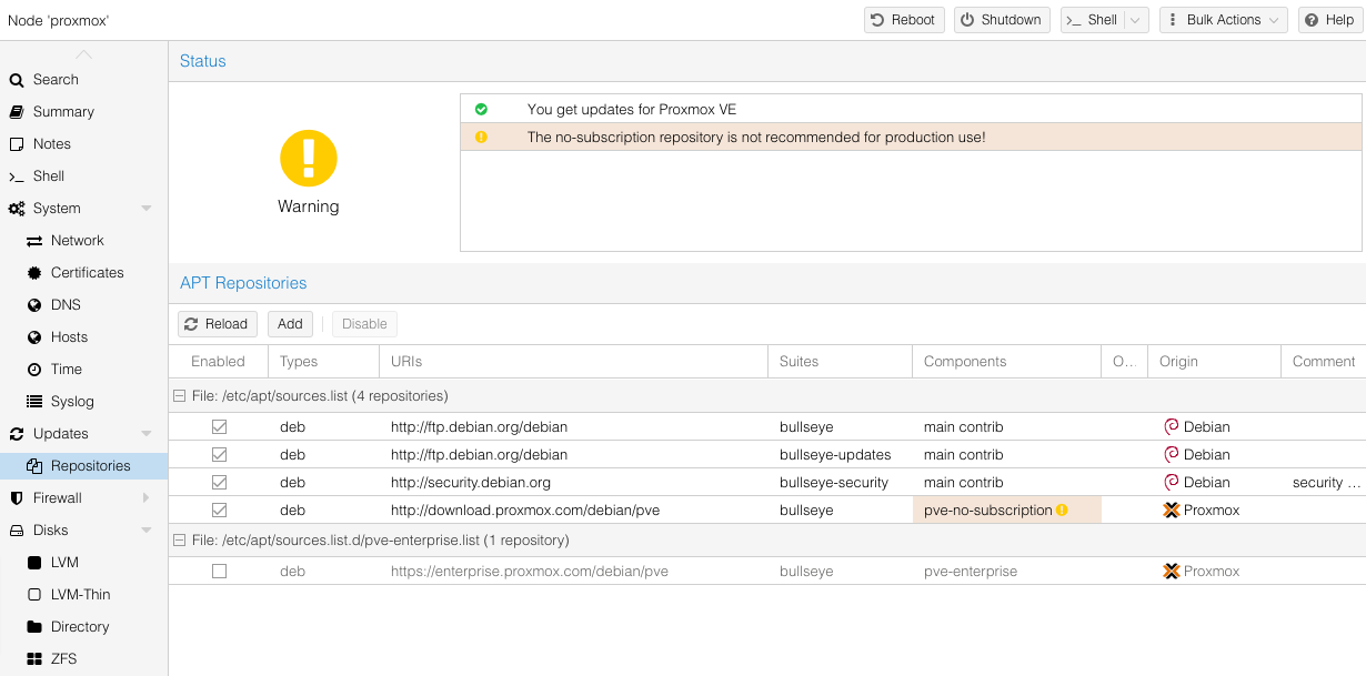 Proxmox VE giờ đã được kích hoạt sử dụng kho ứng dụng No-Subscription repo và sẵn sàng để được cập nhật. Proxmox sẽ hiện ra thông báo “The no-subscription repository is not recommended for production use!”, nghĩa là không nên dùng cho repo này cho công việc, kinh doanh. Còn dùng chơi ở nhà để vọc vạch nghiên cứu thì không sao.