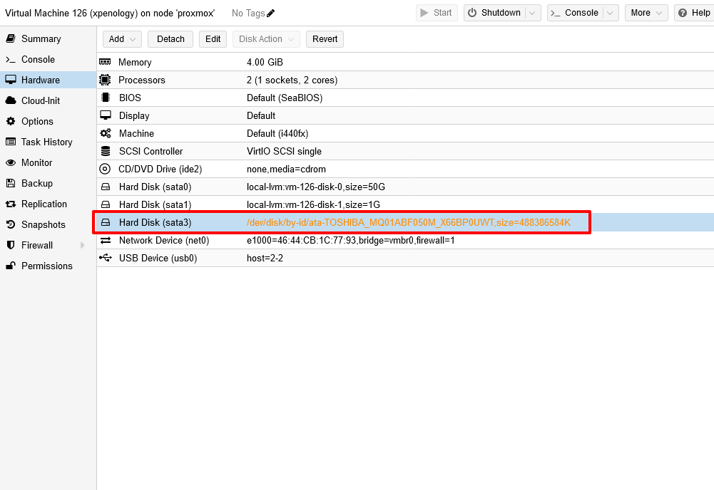 NAME MAJ:MIN RM SIZE RO TYPE MOUNTPOINT DEVICE-ID(S)sda 8:0 0 465.8G 0 disk /dev/disk/by-id/ata-TOSHIBA_MQ01ABF050M_X66BP0UWT /dev/disk/by-id/wwn-0x5000039752682108nvme0n1 259:0 0 953.9G 0 disk /dev/disk/by-id/nvme-eui.002538ba71be0f6a /dev/disk/by-id/nvme-SAMSUNG_MZVLW1T0HMLH-000L7_S35ANX0JA08970Mình muốn Passthrough ổ cứng TOSHIBA (465.8G) vào máy ảo XPENology, ghi lại id của nó: ata-TOSHIBA_MQ01ABF050M_X66BP0UWT.