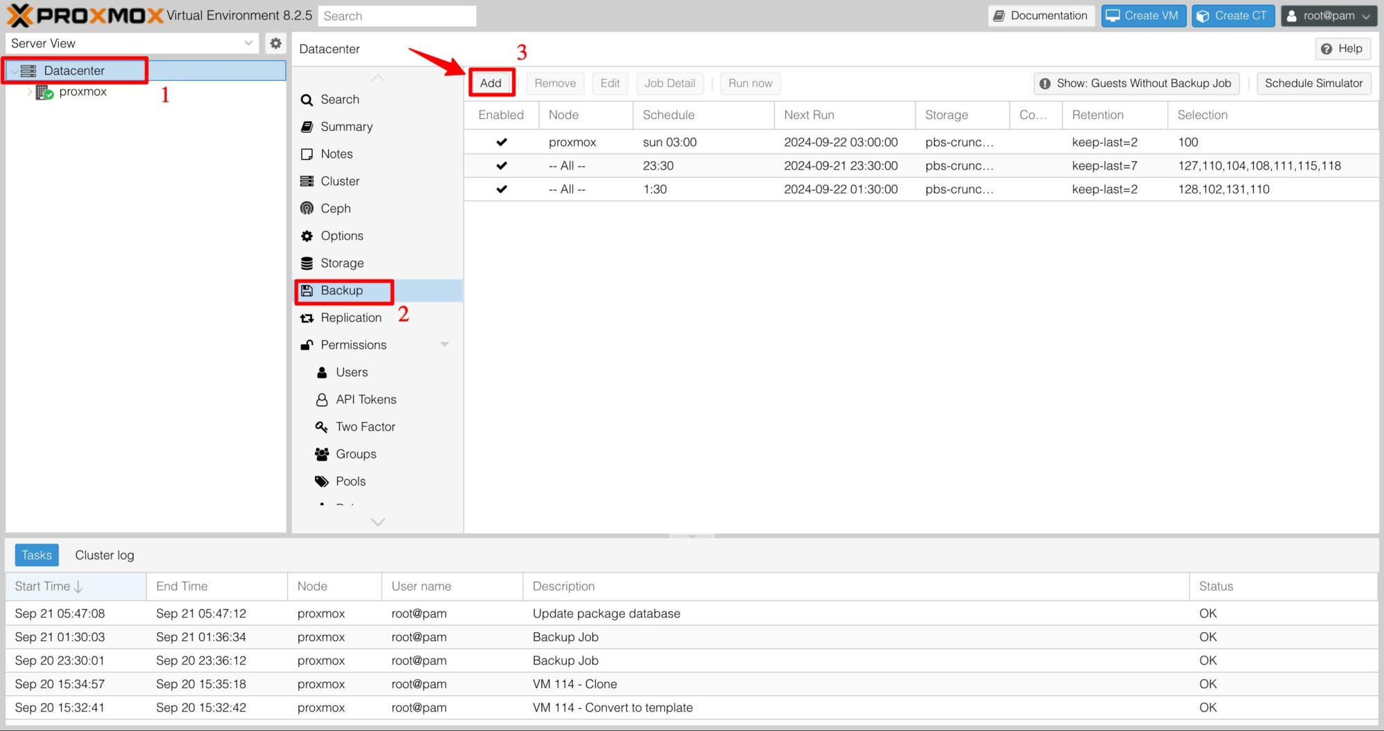 Truy cập vào phần Datacenter —> Backup, bấm nút Add để tạo lịch sao lưu mới.