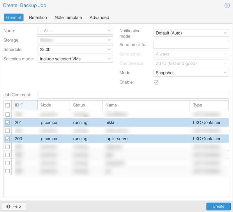 Selection mode: Include selected VM, sau đó chọn các VM, LXC cần sao lưu