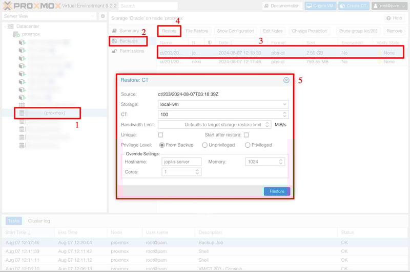 3. Phục hồi VM / LXC từ bản sao lưu