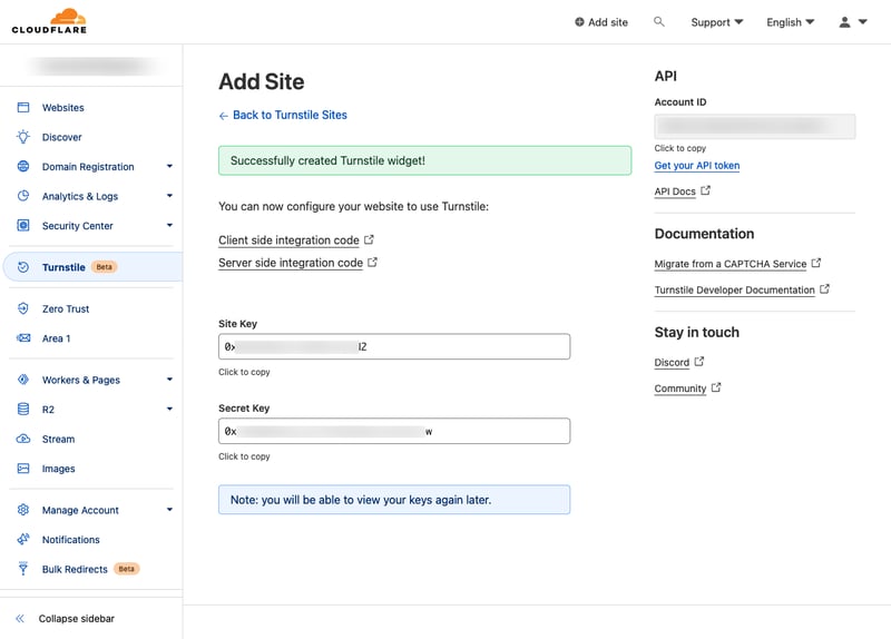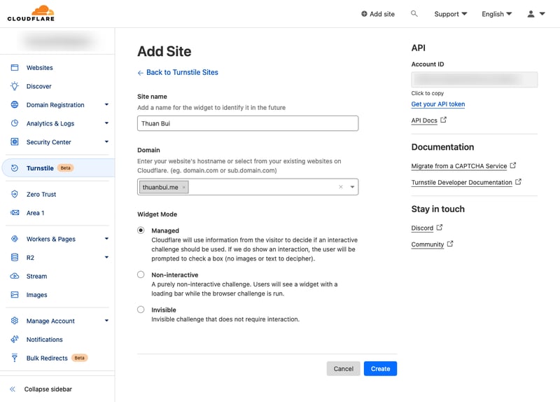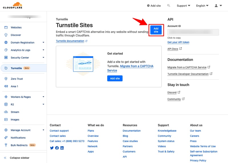 Đăng nhập vào Cloudflare, truy cập vào mục Turnstile (Beta) và bấm vào Add site.