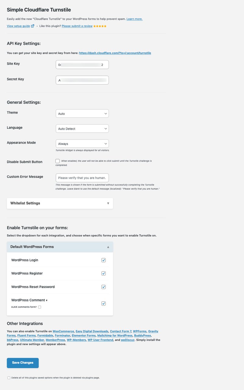 Cài đặt và kích hoạt plugin Simple Cloudflare Turnstile. Nhập Site Key và Secret Key lấy từ bên Cloudflare. Ở dưới cùng, chọn các loại form bạn muốn tích hợp sử dụng Turnstile.