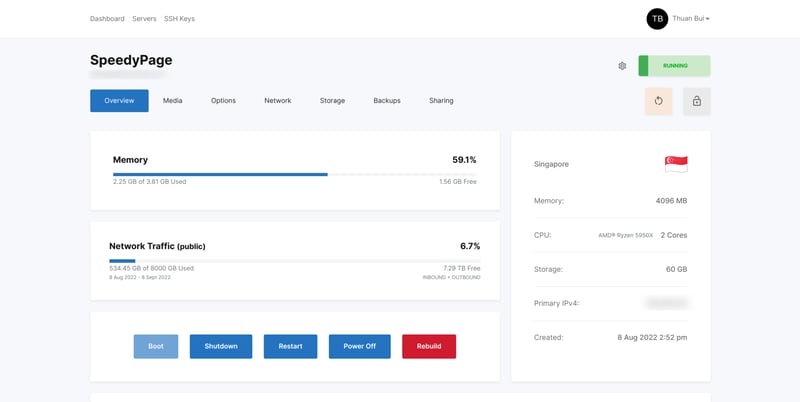 Dưới đây là Dashboard quản lý của SpeedyPage sau khi đăng nhập, nhìn khá giống Dashboard của bên Vultr.