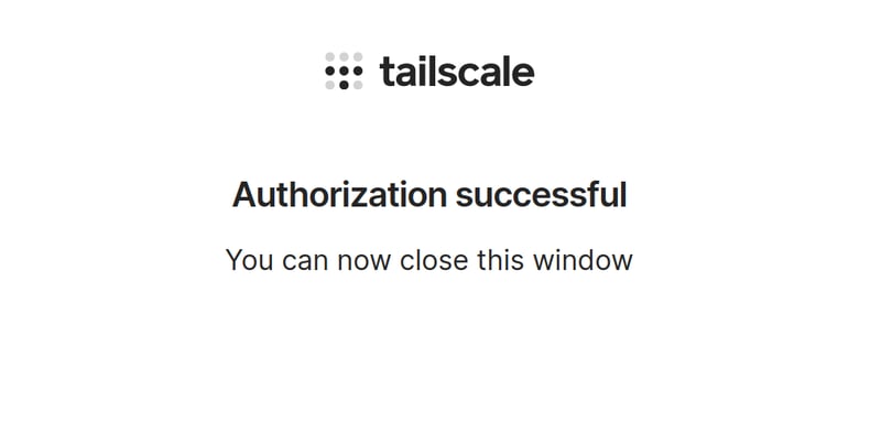 https://login.tailscale.com/a/7b6e22b9f748Sau khi đăng nhập thành công, trình duyệt sẽ hiện ra thông báo “Authorizatoin successful”. Đồng thời trong Terminal cũng sẽ hiện ra thông báo Success.