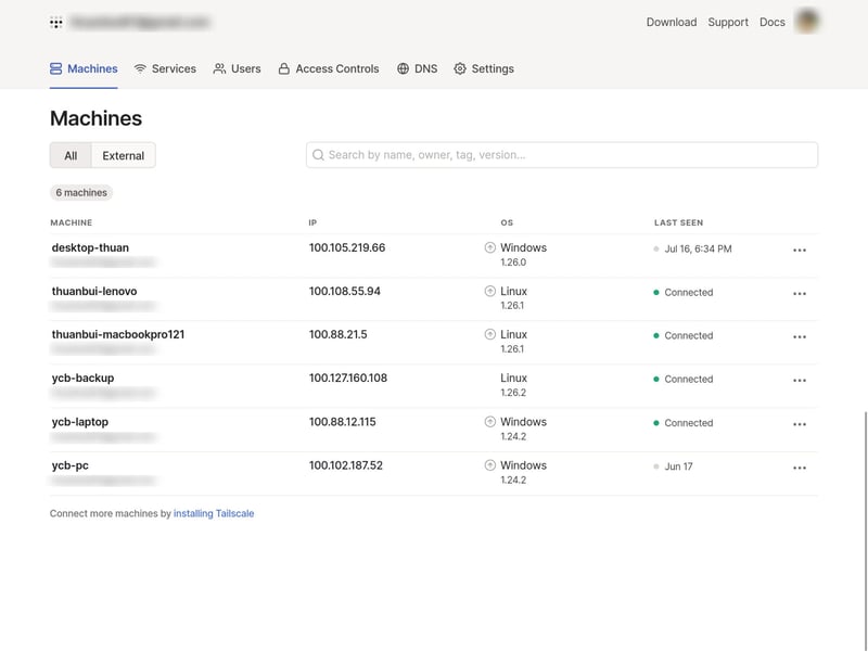 Trong hình trên là tài khoản của mình với các thiết bị đã được cài đặt Tailscale, được cấp địa chỉ IP riêng trong mạng riêng.