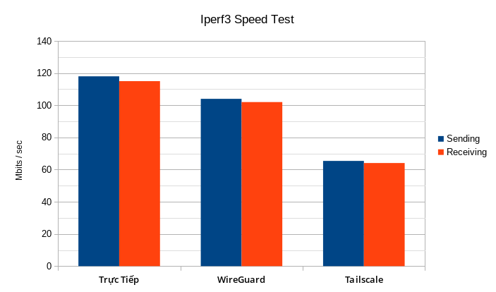 Có thể thấy rõ sự chênh lệch giữa Tailscale và WireGuard / Trực tiếp. Tốc độ kết nối của WireGuard gần bằng với kết nối trực tiếp, nhưng Tailscale chỉ đạt hơn phân nửa. Tuy vậy, tốc độ của Tailscale vẫn là rất ấn tượng, nếu so sánh với OpenVPN. Nhiêu đó là đủ đáp ứng cho nhu cầu sử dụng của mình.
