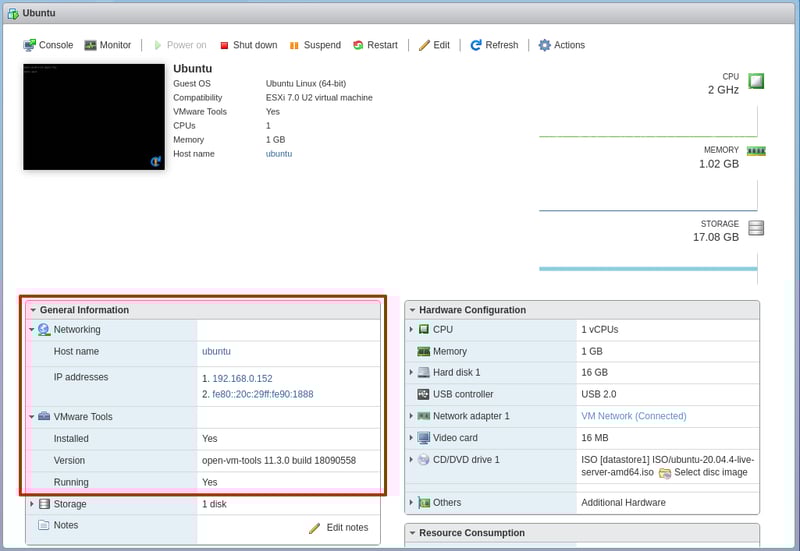 sudo pacman -S open-vm-toolsSau khi cài đặt xong, khởi động lại máy ảo, bạn sẽ thấy trong bảng General Information đã hiện ra thông tin VMWare Tools đã được cài đặt. Đồng thời IP của của máy ảo cũng được hiển thị ra trên ESXi.