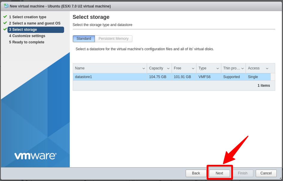 Chọn nơi lưu máy ảo: do máy chủ chỉ có 1 ổ cứng nên mặc định chọn datastore1. Bấm Next