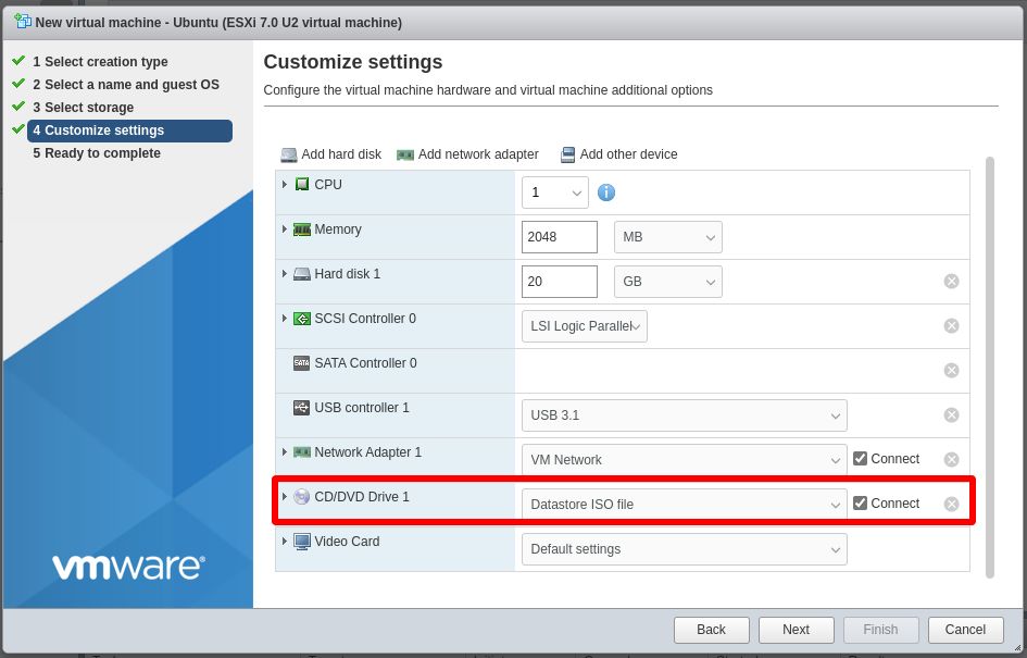 Thiết lập phần cứng: CPU, Memory, Hard disk,… cho máy ảo. Phần CD/DVD Drive 1, chọn Datastore ISO file và chọn file ISO đã tải ở về ở bước trước đó. Bấm Next để tiếp tục.