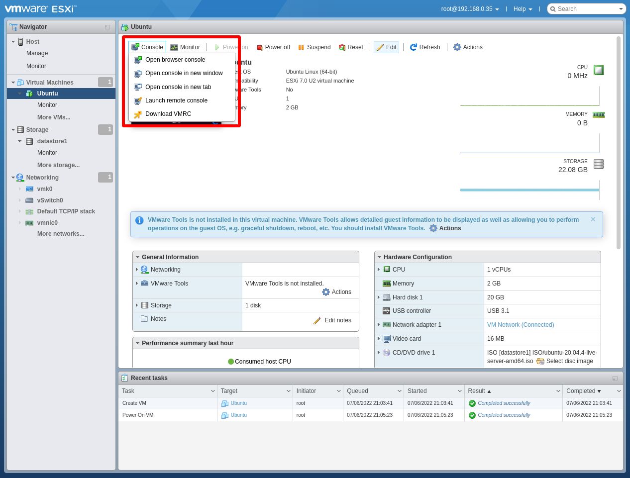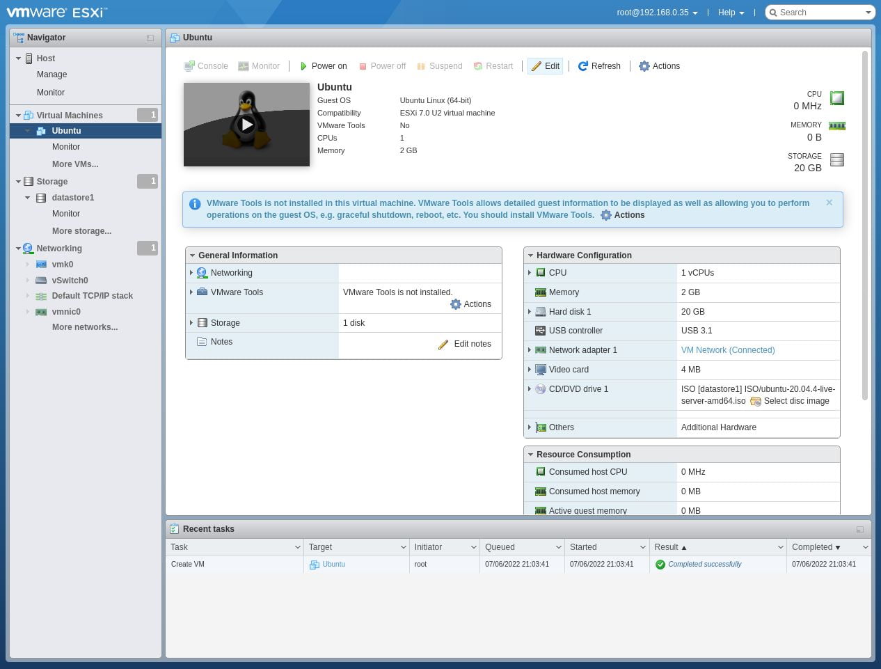 Chỉ mất vài giây để ESXi tạo máy ảo mới. Bạn có thể bấm vào tên máy ảo ở cột bên trái để xem chi tiết thông tin về máy ảo vừa tạo.