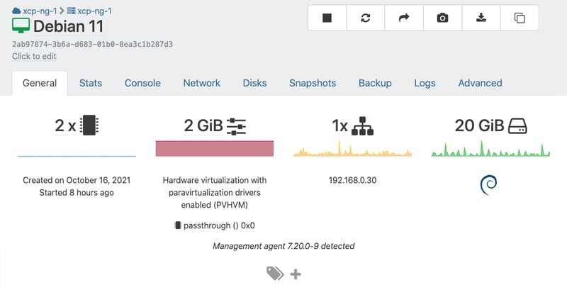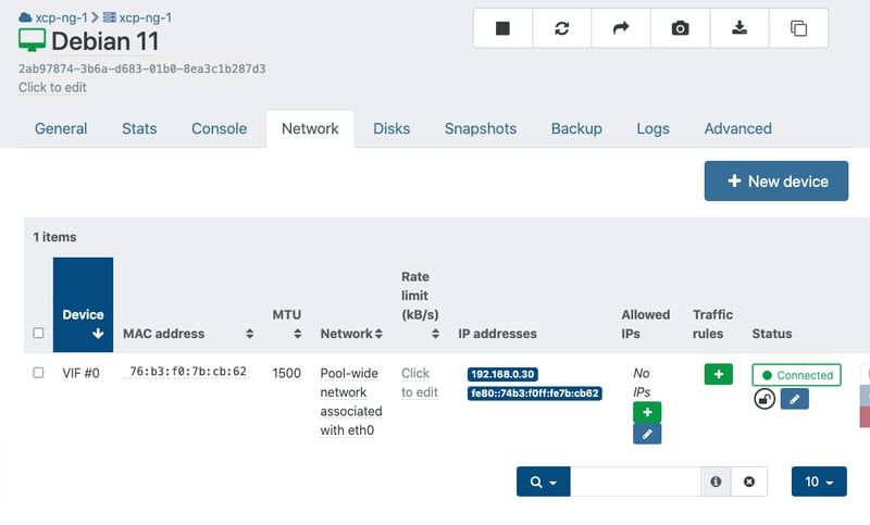 Ngoài ra, khi truy cập vào tab Network, bạn sẽ thấy XOA hiển thị địa chỉ IP của máy ảo. Nếu chưa cài guest-tools, địa chỉ IP sẽ không hiện ra ở đây.