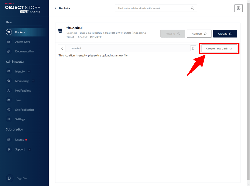 Bạn có thể tạo thêm thư mục con bên trong Bucket bằng cách bấm vào Create new path.