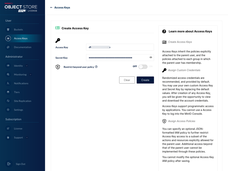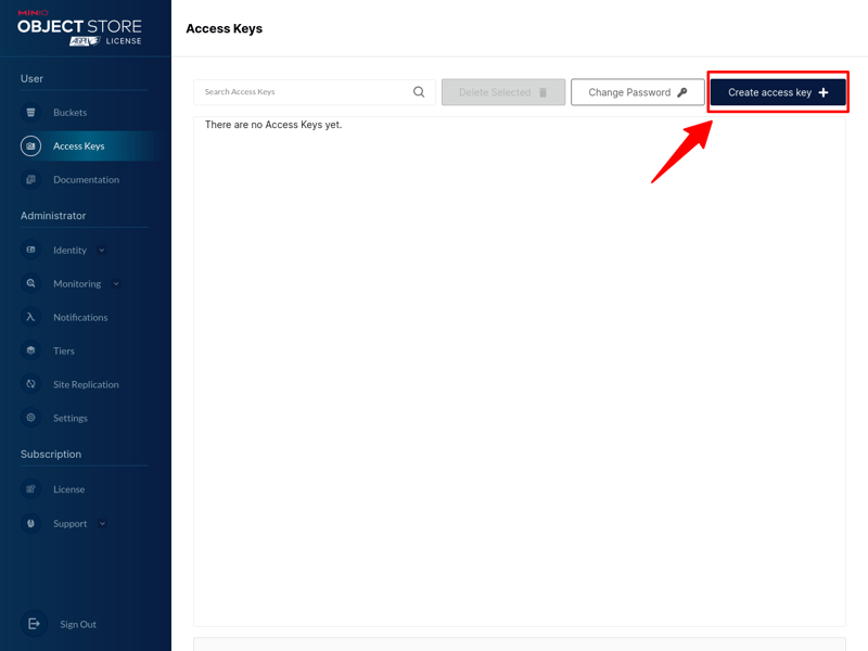 Để truy cập vào hệ thống lưu trữ của MinIO, chúng ta cần tạo Access Keys để cấp quyền.