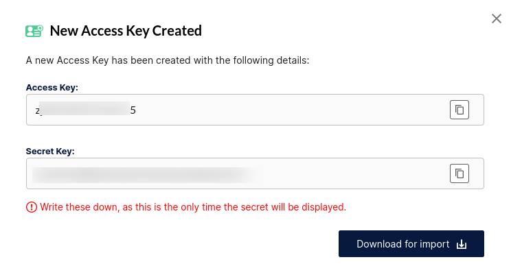 Phần Secret Key sẽ chỉ ra hiện ra một lần duy nhất. Bạn cần lưu lại để sử dụng sau. Hoặc có thể bấm nút Download for import để tải thông tin về máy, sẽ cần dùng để cấu hình MinIO Client ở bước sau.