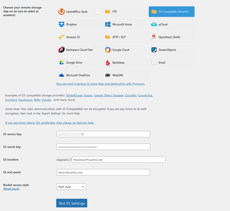 Mục đích chính của mình khi thiết lập Object Storage Server bằng MinIO là để sao lưu các trang WordPress bằng plugin Updraft Plus. Truy cập vào phần Settings, chọn S3-Compatible (Generic), nhập vào thông tin