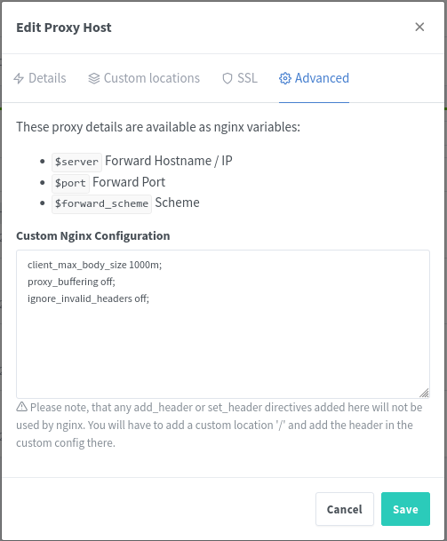 client_max_body_size 1000m;proxy_buffering off;ignore_invalid_headers off;