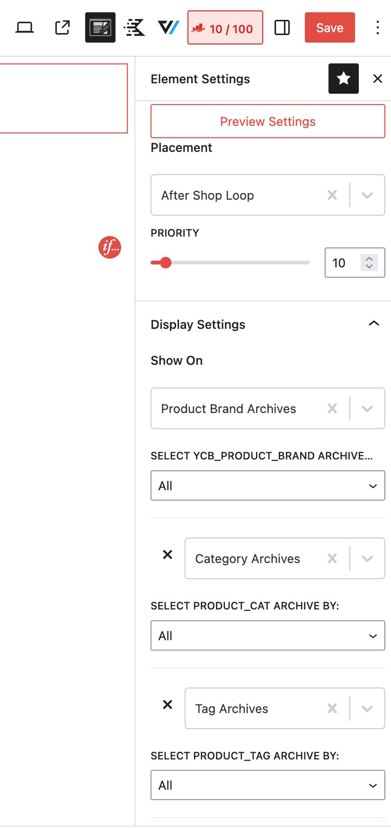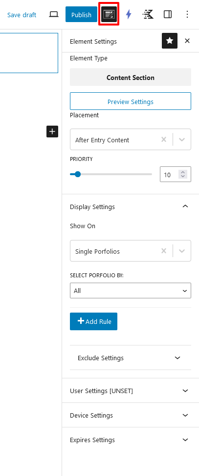 Bấm vào biểu tượng Element Settings ở cạnh nút Publish để hiển thị mục cấu hình cho Hook Elements.