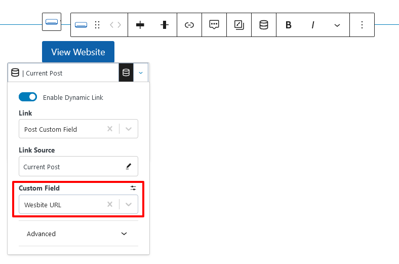 Mình muốn hiển thị 1 nút bấm với URL là nội dung của custom field Website URL đã thiết lập trước đó. Chèn block Button (Adv) vào bài viết