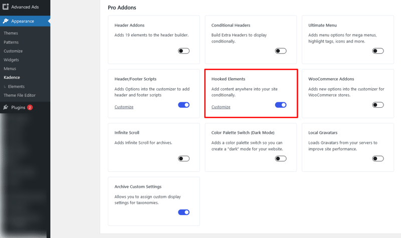 Truy cập vào menu của Kadence nằm trong mục Appearance và kích hoạt tính năng Hook Elements.