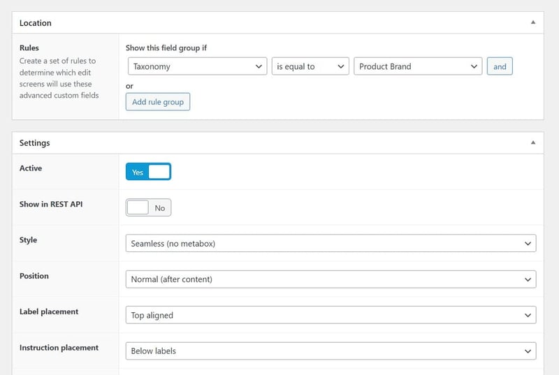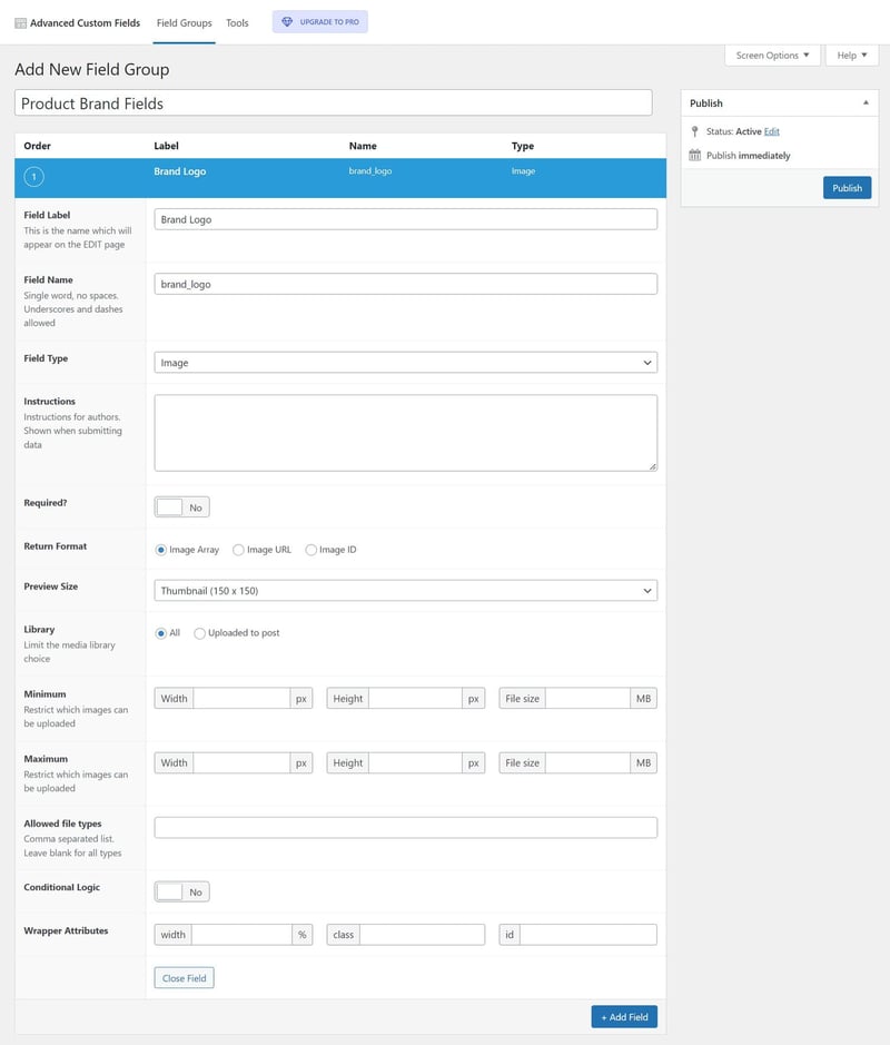 Mình sử dụng plugin Advanced Custom Fields để tạo thêm field Image cho Product Brand. Image field này dùng để tải lên hình ảnh logo của thương hiệu.