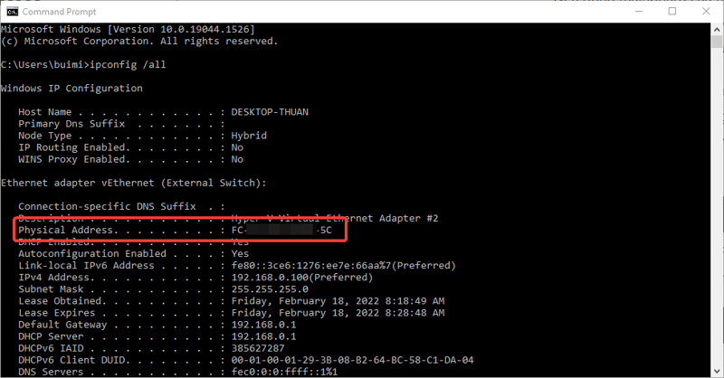 Physical Address hiện ra trong kết quả trả về chính là MAC Address của PC.