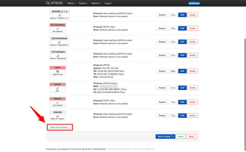 Trên giao diện Luci, truy cập vào mục Network > Interfaces. Bấm vào nút Add new Interface…