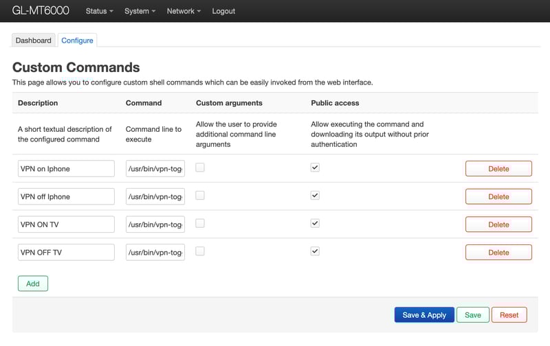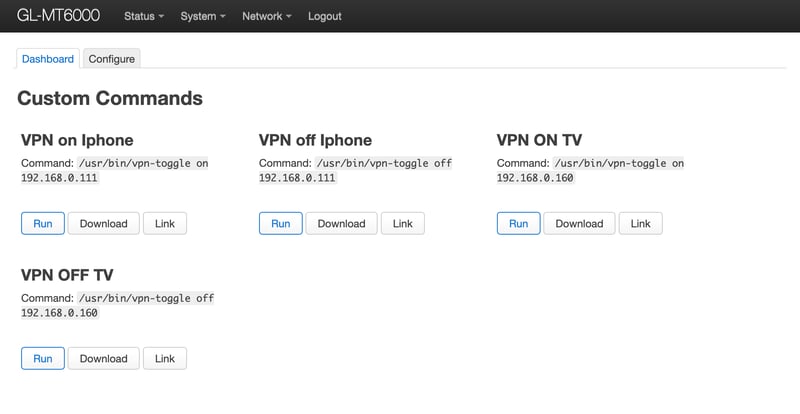Để có thể kích hoạt tắt mở VPN bằng trình duyệt web, mình sẽ dùng tính năng Custom Commands.