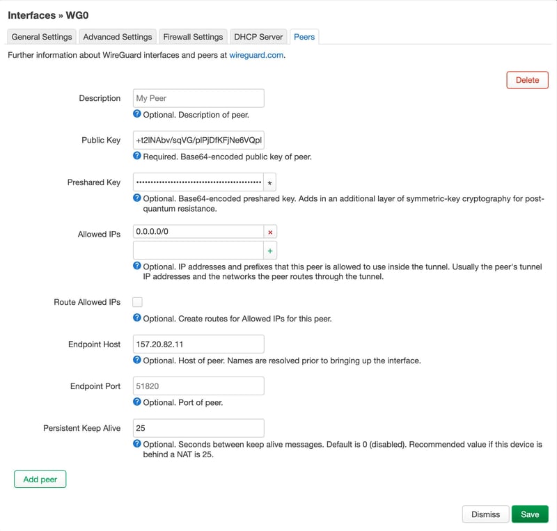 Public Key & Preshared Key: nhập thông số từ file cấu hình WireGuard client.