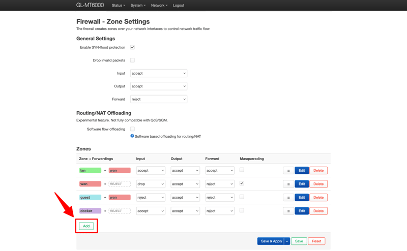 Truy cập vào mục Network > Firewall. Bấm Add để tạo zone mới