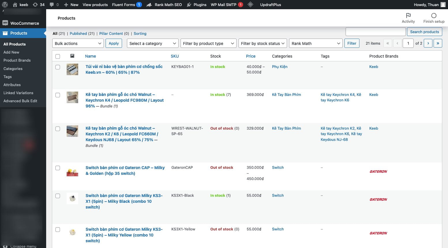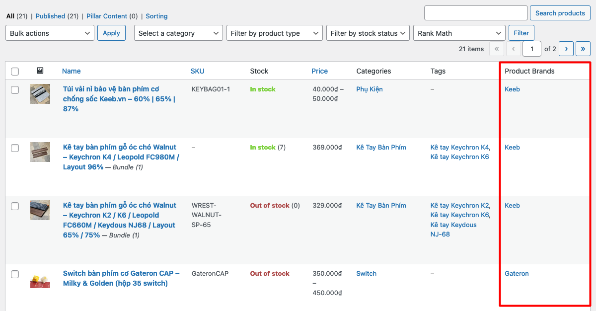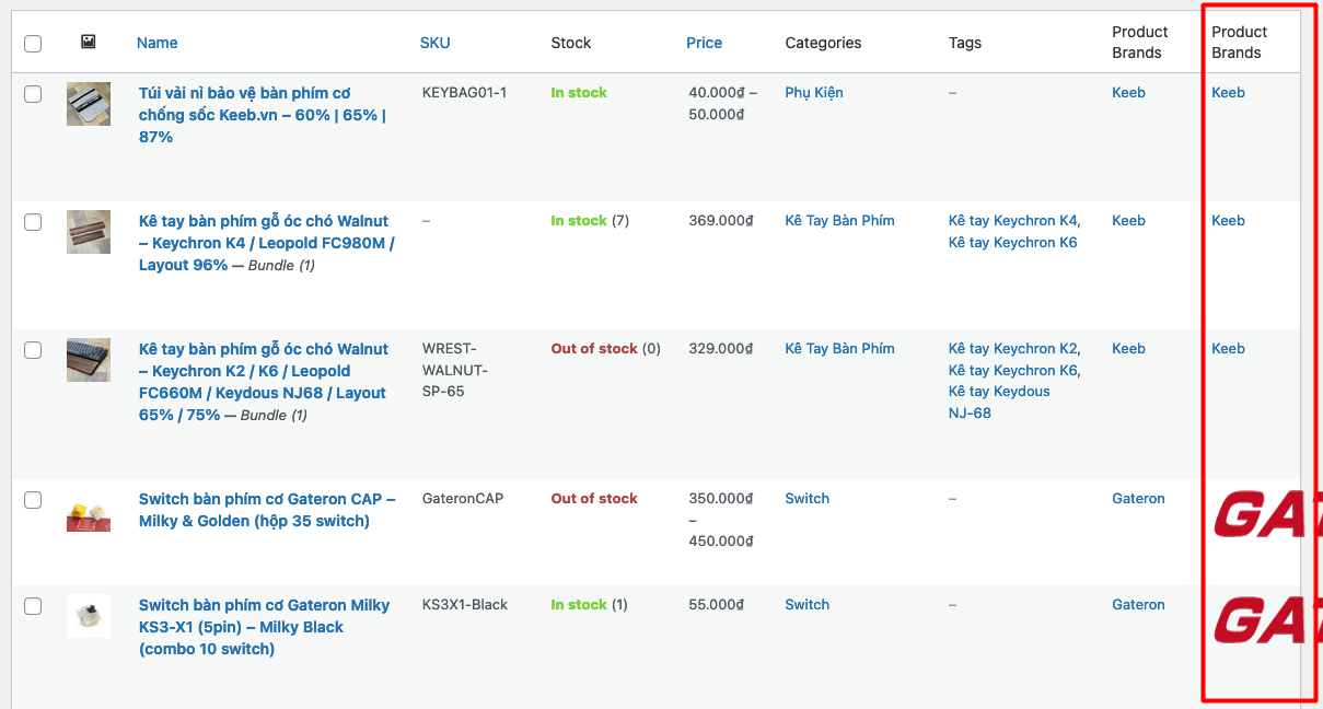 function display_brand_logo_column($column, $post_id) { global $post; if ('brand_logo' === $column) { $terms = get_the_terms($post_id, 'tb_product_brand'); if ($terms && !is_wp_error($terms)) { foreach ($terms as $term) { $image_id = get_term_meta($term->term_id, 'brand_logo', true); if ($image_id) { $image = wp_get_attachment_image($image_id, 'full', false, array('class' => 'brand-logo', 'alt' => $term->name)); echo sprintf('<a href="%s">%s</a>', get_edit_term_link($term->term_id), $image); } else { echo sprintf('<a href="%s">%s</a>', get_edit_term_link($term->term_id), $term->name); } } } }}Thêm 1 cột mới đã hiện ra trong trang quản lý sản phẩm như hình dưới
