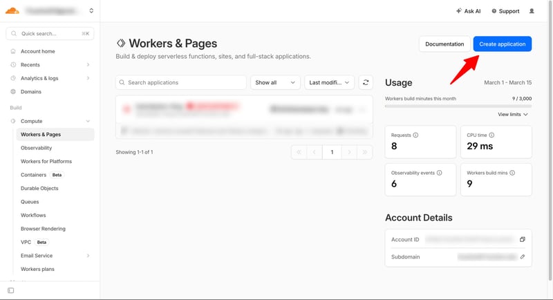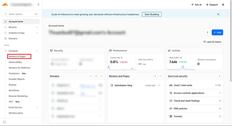 Truy cập dash.cloudflare.com, bấm vào mục Workers & Pages