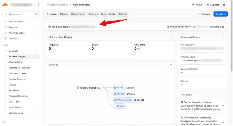 Chờ vài phút để Cloudflare xử lý. Sau khi hoàn thành, bạn sẽ thấy hiện ra trang Dashboard như bên dưới. Bấm vào link có dạng project-name.usernamer.worker.dev để xác nhận blog đã chạy ngon lành trên hệ thống CDN của Cloudflare.