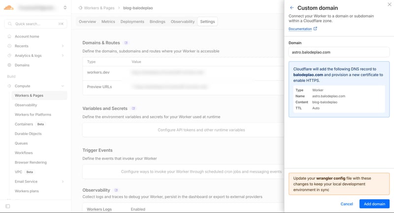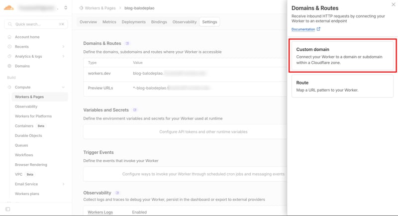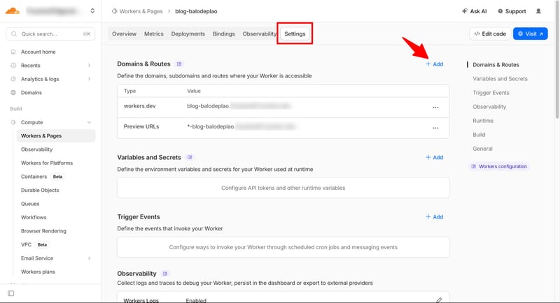 Truy cập vào phần Setting của dự án trên Cloudflare Workers, phần Domain & Routes, bấm nút Add
